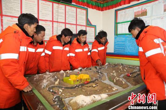 图为近日,阿里地区公路养护段护路工人在看工区道路的沙盘图。 阿旺扎西 摄