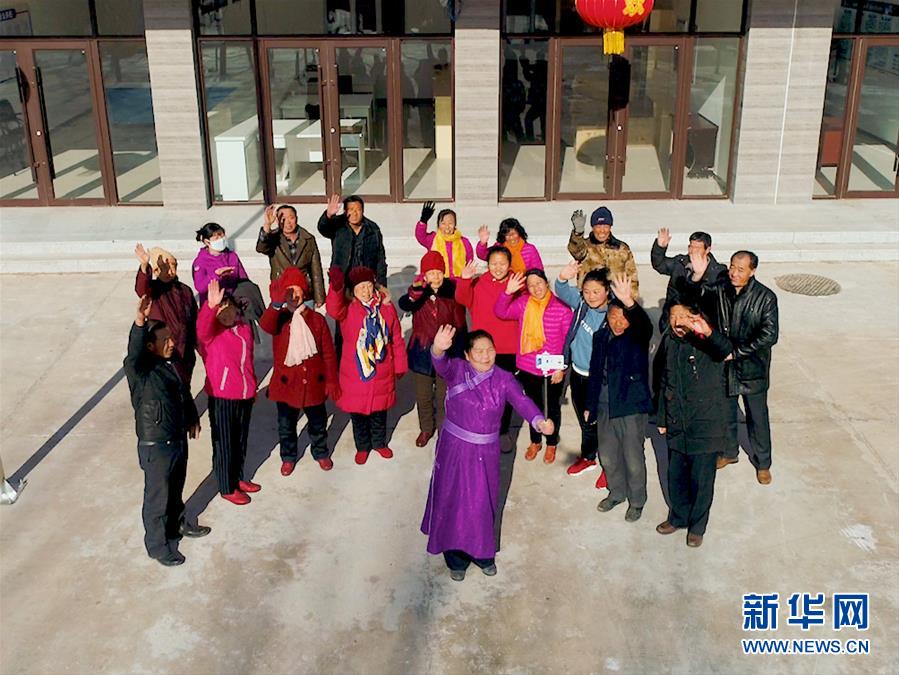 赵会杰和小庙子村村民站在村党群活动中心前,一起自拍录视频。新华社发(视频截图)