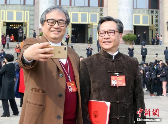 资料图片:2017年3月15日,十二届全国人大五次会议在北京人民大会堂闭幕,香港代表团王敏刚和澳门代表团高开贤在会场外自拍。中新社记者 杨可佳 摄