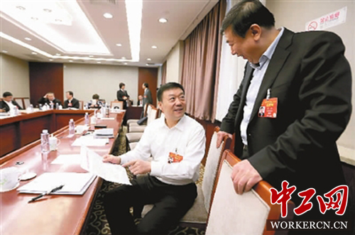 3月13日下午,在山西代表团小组审议开始前,山西省人民检察院检察长杨景海代表(图左)和山西省财政厅厅长武涛代表分享财政部办公厅给他的回复。几天前,在审议《关于2018年中央和地方预算执行情况与2019年中央和地方预算草案的报告》时,杨景海代表建议在报告中增加“缓解企业融资难融资贵问题”的表述,最终这条建议被财政部采纳,并给他进行了书面回复。