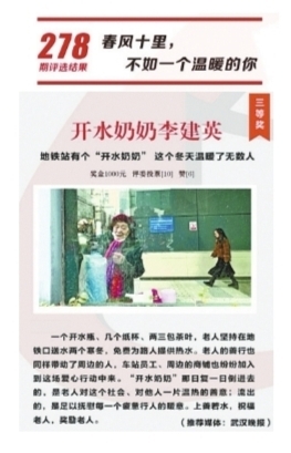 13日,阿里巴巴集团联合多家主流媒体共同打造的大型公益平台“天天正能量”传来好消息,由长江日报、武汉晚报报道的《广埠屯地铁站有个“开水奶奶”》,获得三等奖,奖金1000元。但老奶奶委托武汉晚报,要将这个奖金捐献给需要的人。