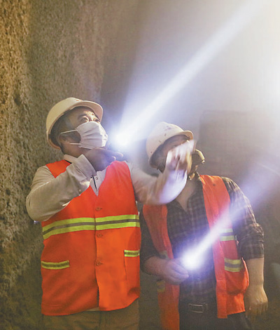 潘福平(左)在检查隧道初支质量。徐章位摄(人民视觉)
