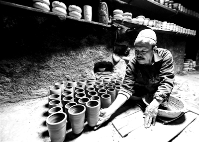 家住新疆喀什地区的手艺人吾麦尔·艾力在家中制作土陶(2018年3月14日摄)。