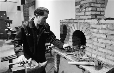 3月18日,浙江杭州,丁纪灿在加热剪刀部件。