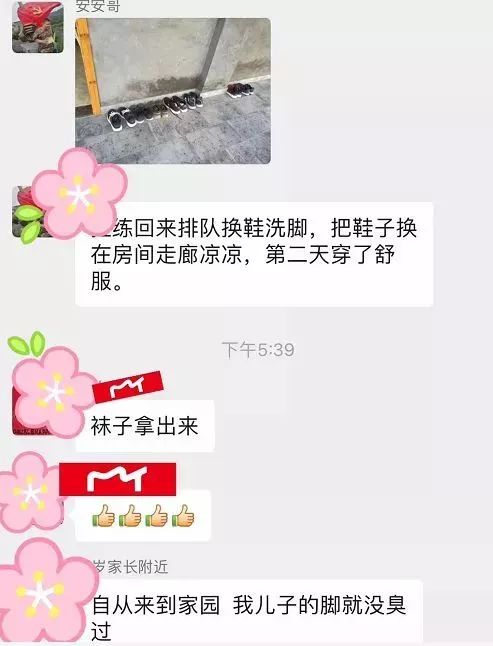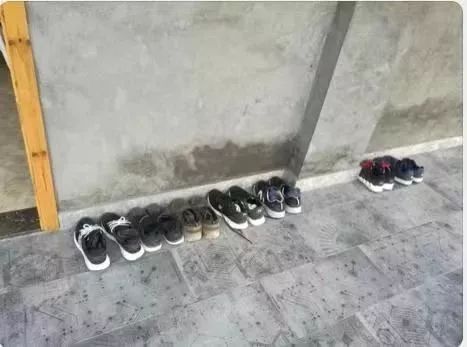 有一次,曹舅带孩子们锻炼回来,排队换鞋洗脚,他把鞋子整齐排在屋外走廊晾晒,拍了张照片发到微信群,竟然引发了家长们的大讨论。