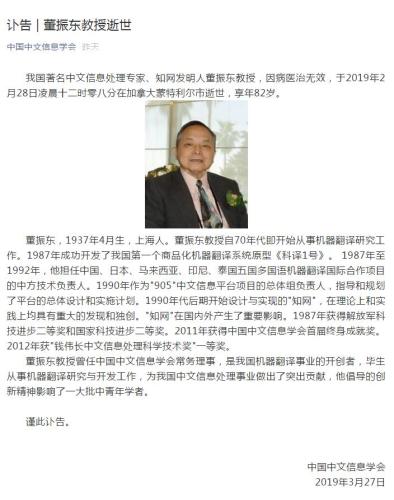中新网客户端3月28日电(记者 宋宇晟) 中国中文信息学会日前发布讣告,著名中文信息处理专家、知网发明人董振东教授,因病医治无效,于2019年2月28日凌晨十二时零八分在加拿大蒙特利尔市逝世,享年82岁。文中称,上世纪90年代后期,董振东开始设计与实现的"知网",在理论上和实践上均具有重大的发现和独创,并在国内外产生了重要影响。