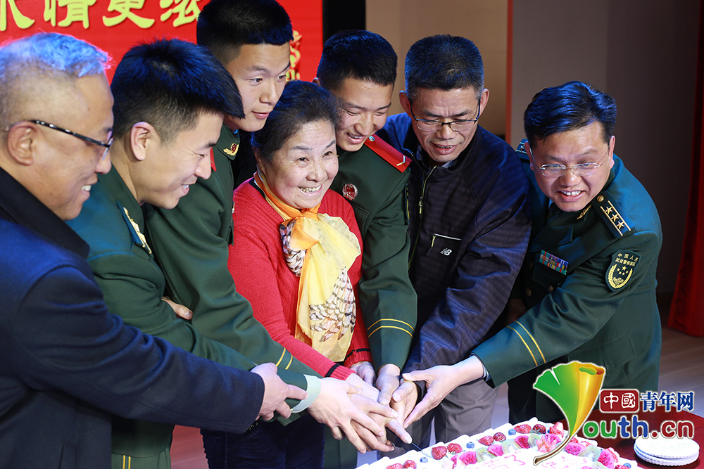 在北京东直门社区举办的拥军庆祝活动上,她穿着喜庆的大红毛衣,锃亮的黑发被拢在脑后盘成发髻。舞台上,她的“兵儿子们”唱、跳,出演小品《人间有真爱》,看着精神又利索。情到深处,战士们整齐列队向她行军礼、拥抱她。