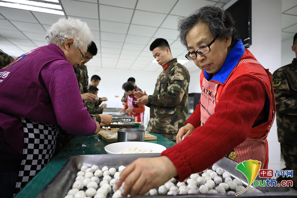 元宵节,拥军队的“兵妈们”和战士一起揉元宵。武警北京市总队执勤第二支队供图