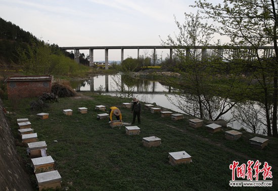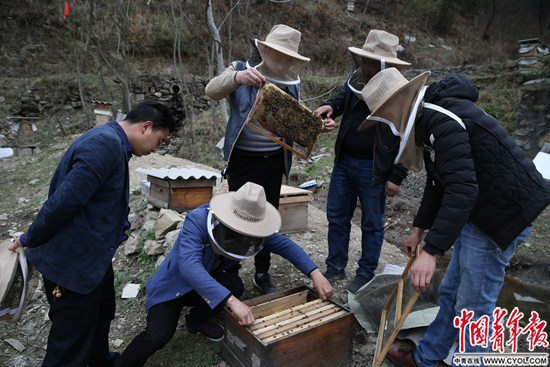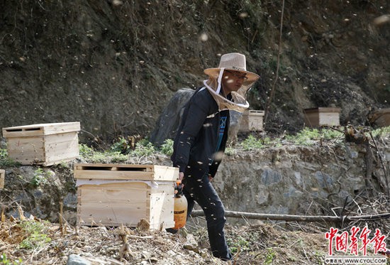 3月24日,地处秦岭南麓的陕西省略阳县蹇家坝村,技术员薛新福拎着喷水壶准备给蜂箱洒水降温。这家由当地年轻人创办的生态农业公司,通过养殖中华蜂创业,帮助当地贫困农户增收致富。