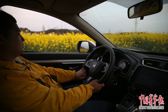 陕西省勉县,张崇军开车经过一片油菜花地。