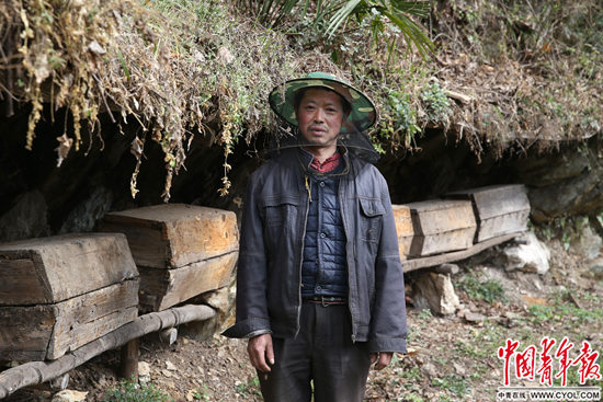 略阳县林口村,贫困户张玉华在自家的蜂箱前。