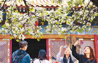 春日里,游客在故宫的梨花树下拍照。祝振强摄