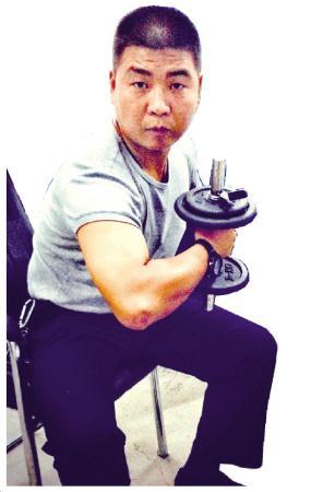 鲍志斌在办公室里“举铁”锻炼臂力。