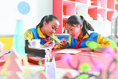 内蒙古航天小学学生在劳动技能课上设计木制品。王正摄/光明图片