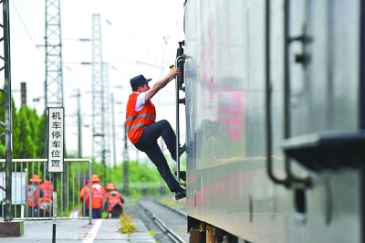 全国劳模郭学飞登上火车准备进入工作岗位。新华社发