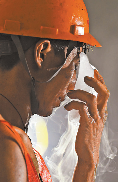 工人正在用冰块降体温。