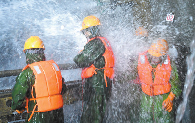 工人们身顶涌水作业。