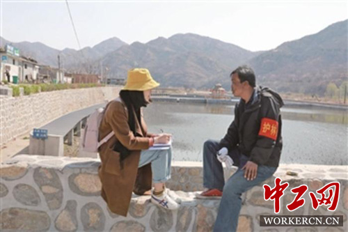 本报记者吴丽蓉(左)在河北省平山县南文都村采访当地村民。