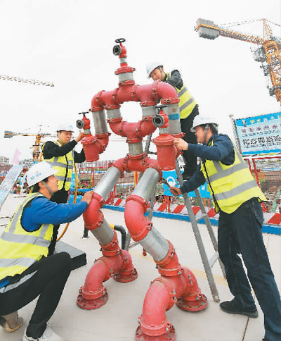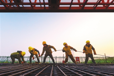 江西省南昌市洪都大道高架桥建设中,农民工兄弟们正齐心协力穿高架桥钢索。黄建军摄(人民视觉)