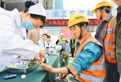 日前,安徽省合肥市庐阳区大杨镇计生协、十张村联合辖区医院开展“维护人人健康 迈向全面小康”免费体检进工地活动,免费为农民工测量血压、血糖,并提供内科、外科等专科检查。葛传红摄(人民视觉)