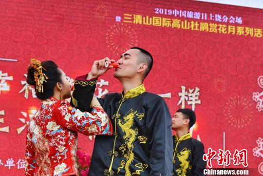 5月19日,来自全国各地的11对情侣身穿中式礼服、手捧杜鹃花,来到江西上饶三清山举行浪漫的杜鹃花婚礼仪式。程希雪 摄