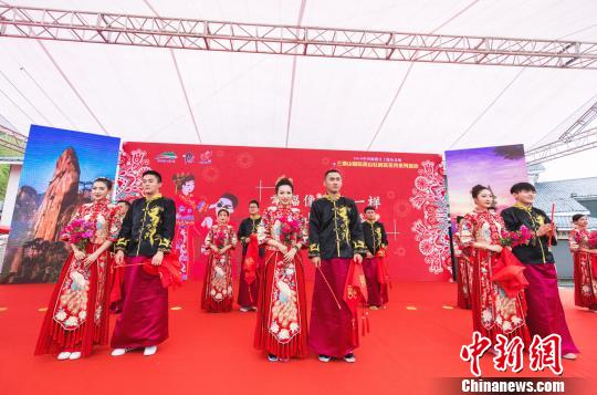 5月19日,来自全国各地的11对情侣身穿中式礼服、手捧杜鹃花,来到江西上饶三清山举行浪漫的杜鹃花婚礼仪式,在海拔1314米的女神峰前留下幸福的瞬间。