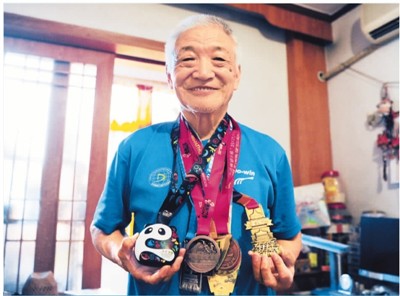 家住西安的陈金钟已年届80岁,他2015年进入健身房,接受专业人员的指导,成为了一名高龄“健身达人”。现在他可以完成卧推60公斤、硬拉73公斤、深蹲70公斤、平板支撑13分钟,并且已经参加过13场全程马拉松。图为陈金钟展示自己获得的马拉松奖牌。新华社记者 张博文摄