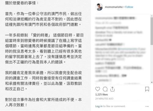 何猷君账户解释道,拍摄时“没思考太多,看到墙上已经有很多其他的留字就跟着写上去了。没有谨慎思考并决定做出不正确的行为,是本人的错误。”并表示会承担责任及配合调查,同时吸取教训及改正自己。