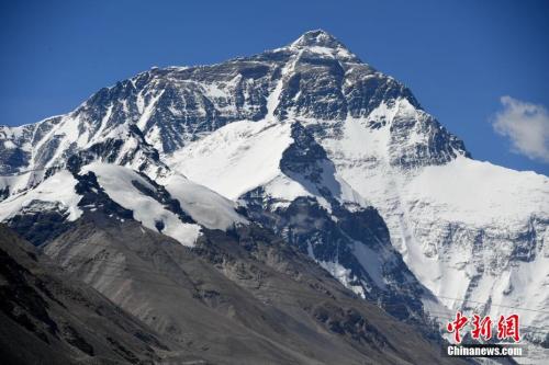珠峰被皑皑白雪覆盖,与蓝天白云相映生辉。张浪 摄