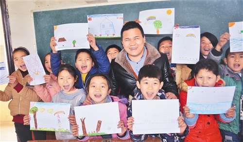 李林(中)为南昌市松湖镇和平小学学生教授美术课。 本报记者 刘 兴摄