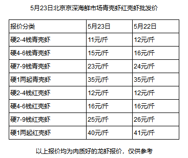 水产养殖网今早上传的5月23日北京京深海鲜市场红壳虾青壳虾批发价显示,个头最小(2-4钱/只)、最便宜的小龙虾批发价仅需11元/斤,比昨天又降了1元。而湖南、江苏、广东等地的价格也和北京差不多,武汉甚至低至9元/斤。