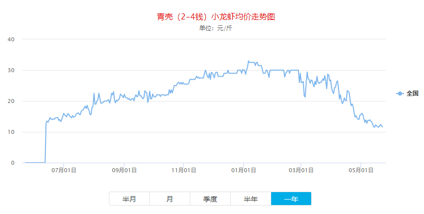 小龙虾价格网上发布的全国小龙虾批发价走势图也显示,近日价格为一年中的低点,均价在11元上下。