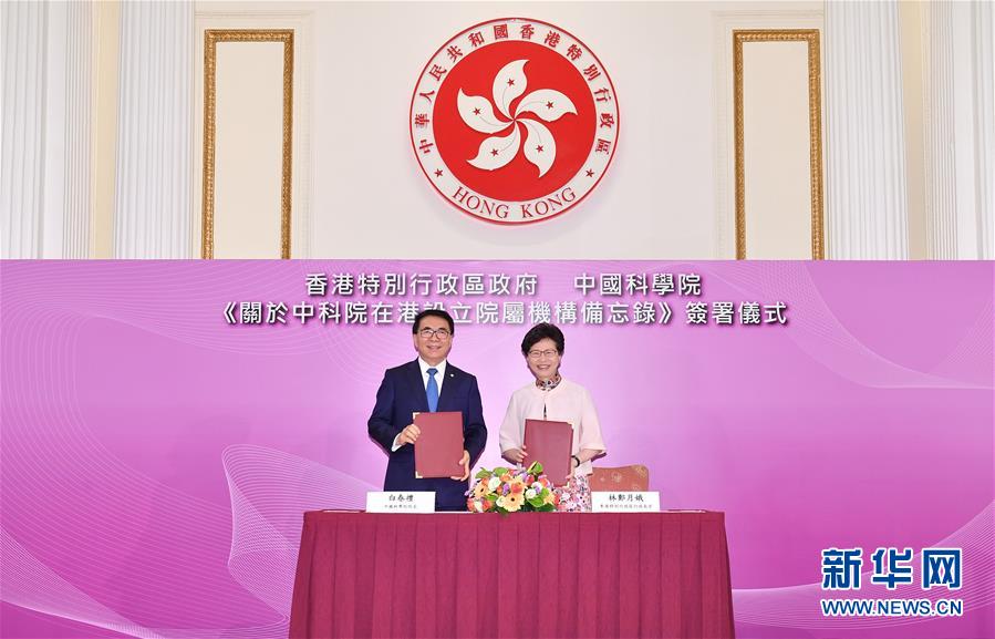 香港特区行政长官林郑月娥(右)和中国科学院院长白春礼在礼宾府签署《关于中国科学院在香港设立院属机构的备忘录》 (2018年11月8日摄)。 新华社发