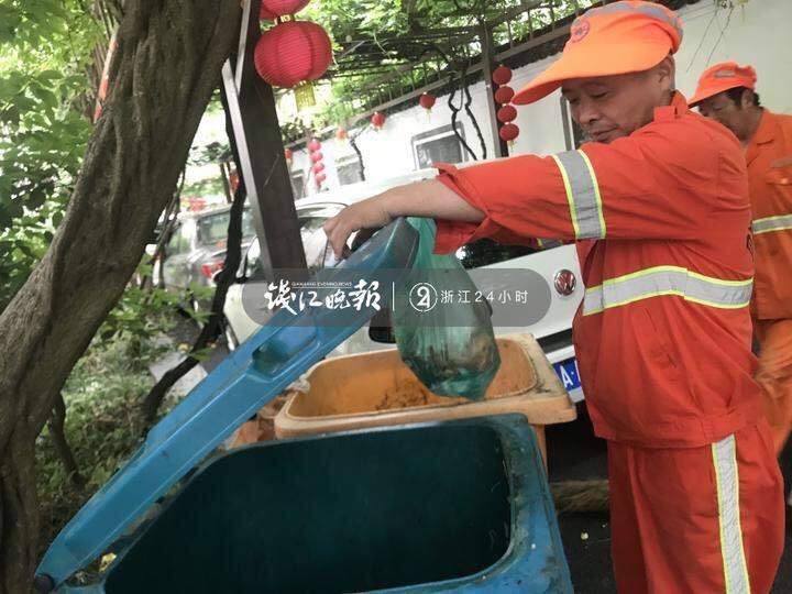 除了清洁社区道路小巷,还要搬运垃圾桶,处理垃圾分类。夫妻俩都是保洁员,月收入不多也不少,老李挺知足的。