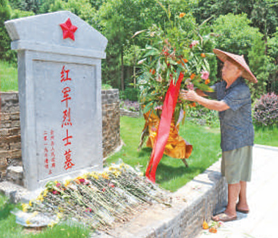 蒋石林在整理人们向红军墓敬献的鲜花。本报记者 刘佳华 摄