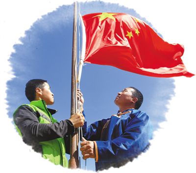 阿迪亚和儿子在升国旗。本报记者 吴勇 摄