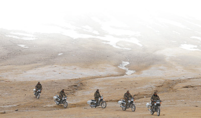 麦麦提努尔和护边小组成员在边境巡逻。本报记者 阿尔达克 摄