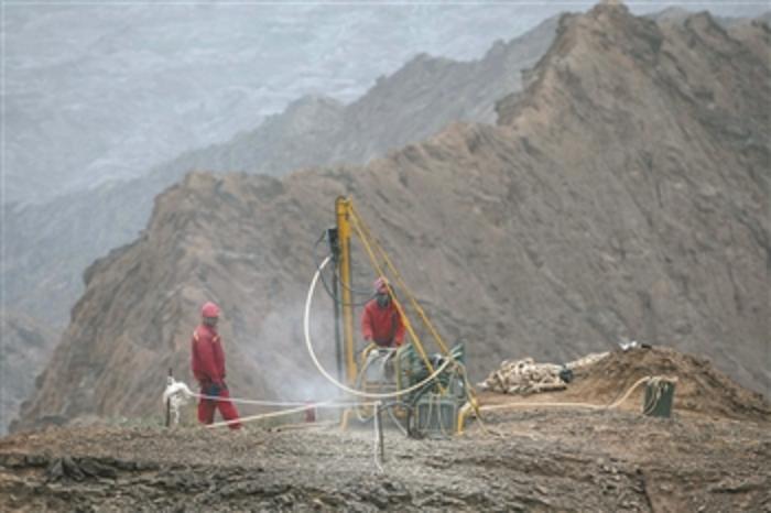 6月12日,物探工人正在山顶钻井。这里干旱少雨,尤其到了夏季,工人们常常要顶着烈日工作。