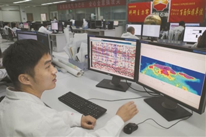 6月10日,东方地球物探公司研究院库尔勒分院,研究员在根据工地采集的数据分析秋里塔格地质情况。