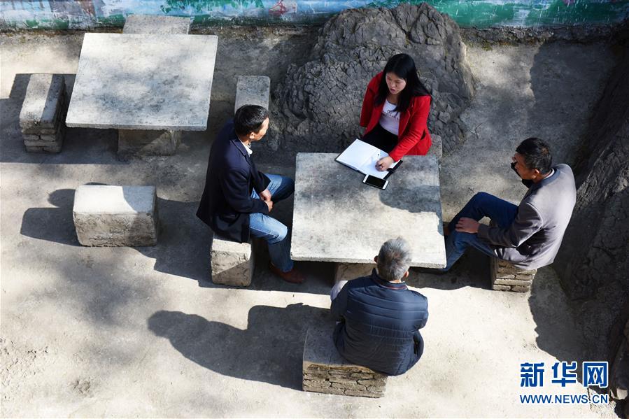 张兴燚(后)与村民们讨论村里修建蓄水池的相关事宜(3月21日摄)。 新华社记者 杨文斌 摄