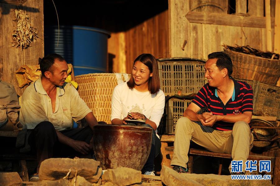 在贵州省石阡县大坪村,左艳(中)在贫困户家了解危房改造情况(2018年8月29日摄)。 新华社记者 杨文斌 摄
