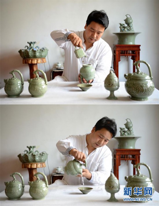 这是一张拼版照片,上图为崔涛往耀州窑倒装壶内注水;下图为崔涛从耀州窑倒装壶往外倒水(7月10日摄)。