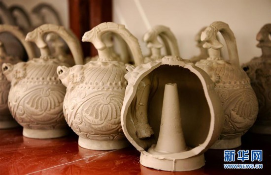耀州窑青釉剔花倒装壶内部构造展示(7月10日摄)。 新华社记者 刘潇 摄