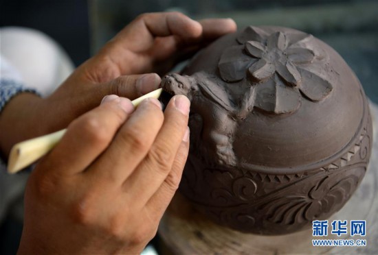 崔涛在对耀州窑青釉剔花倒装壶的壶坯进行刻花(7月10日摄)。新华社记者 刘潇 摄