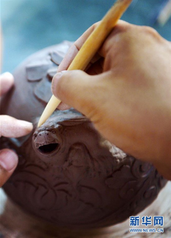 崔涛在对手工制作的耀州窑青釉剔花倒装壶进行刻花(7月10日摄)。新华社记者 刘潇 摄
