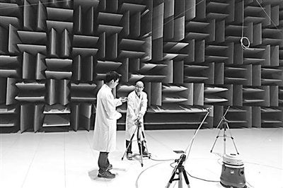 姚磊(右)在声学实验室开展声学振动计量技术研究。