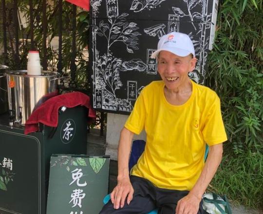 7月末的一天,上午9时许,81岁的顾忠根在志愿者的帮助下,推着装满两大桶凉茶的推车,准时出现在章家桥公交车站附近。