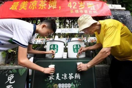 如今,在顾忠根和社区的共同努力下,来自各行各业的志愿者纷纷加入,凉茶摊的“服务员”已壮大到103人,逐渐形成了一个公益联盟。三伏天里,每天都有两名志愿者陪老人在凉茶摊固定“值班”,为有需要的人送上一杯杯清凉。