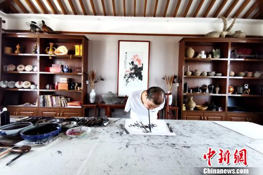 图为王永春咬笔蘸墨。 梅镱泷 摄