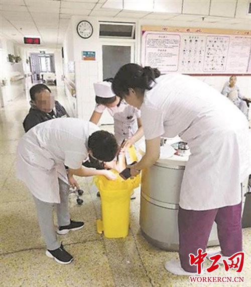 随后,四五位值班医护人员义务给外卖小哥清洗、包扎伤口。为了防止伤口被雨水浸湿,医生们还找来塑料袋把伤脚层层包住,这才让这名骑手继续接单工作。